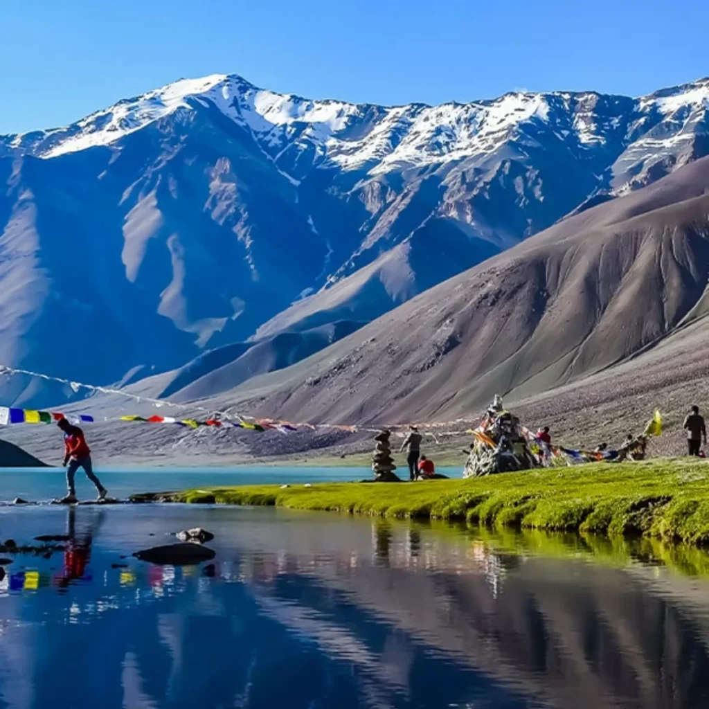 The journey begins near Manali, taking you through dense pine forests, riverside trails, and vast alpine meadows. As you gain altitude, the landscape transforms into rocky terrain and snow-covered slopes. Crossing Hampta Pass at an altitude of approximately 14,100 ft, you witness breathtaking views of surrounding peaks and glaciers. The descent into Lahaul feels like stepping into a different world, with barren mountains and dramatic valleys.
