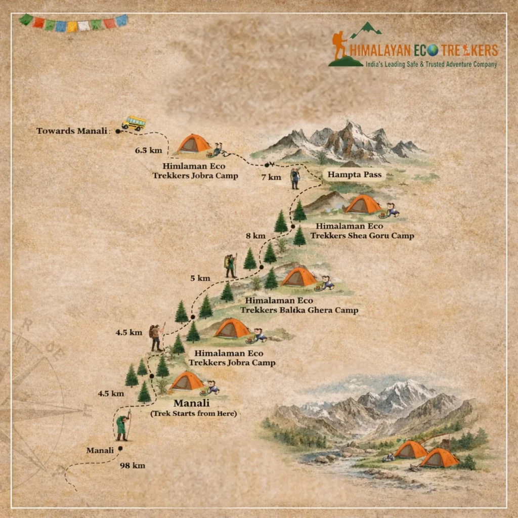 Hampta Pass Trek is one of the most dramatic crossover treks in Himachal Pradesh. It connects the lush green Kullu Valley with the stark, desert-like landscape of Lahaul. This sudden contrast in scenery makes Hampta Pass one of the most unique and visually rewarding treks in the Himalayas.